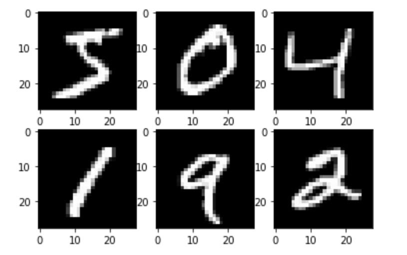 Лучше визуализировать набор данных перед его использованием. Здесь мы строим шесть образцов обучающего набора данных MNIST для визуализации.
